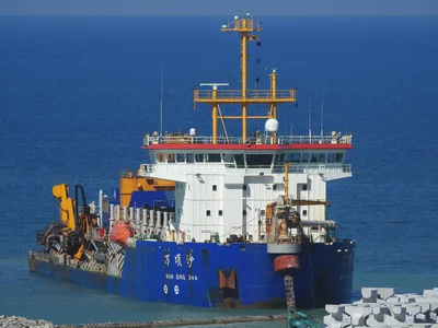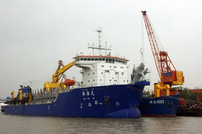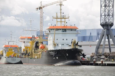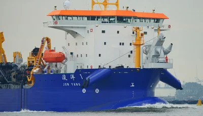 A Trailing Suction Hopper Dredger (TSHD) is a dynamic dredging vessel that removes seabed material while sailing, using trailing suction pipes with dragheads. The dredged material is stored in onboard hoppers, allowing the vessel to transport and discharge it at designated sites. TSHDs are widely used for harbor deepening, coastal maintenance, and land reclamation.
